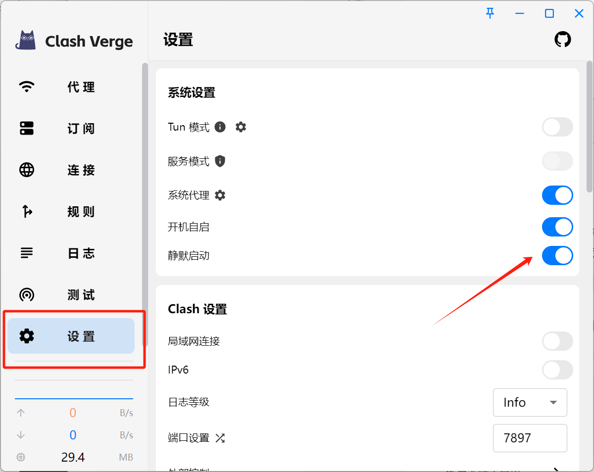 回到设置选项卡中把系统代理打开即配置完毕!这边推荐把开机自启和静默启动也打开!
