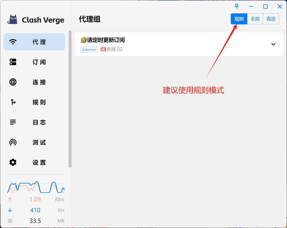 代理这边建议就默认用规则模式,点击订阅组🔽按钮展开所有节点,可以自行选择线路!